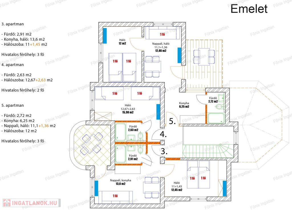 Az épületben 5 külön bejáratú, teljesen felszerelt apartman került kialakításra, mindegyikhez saját konyha és fürdőszoba tartozik. A modern életvitelhez igazodva az épület hőszivattyús fűtési-hűtési rendszerrel, fan-coil egységekkel és napelemmel lett felszerelve, így az üzemeltetési költségek rendkívül kedvezőek.